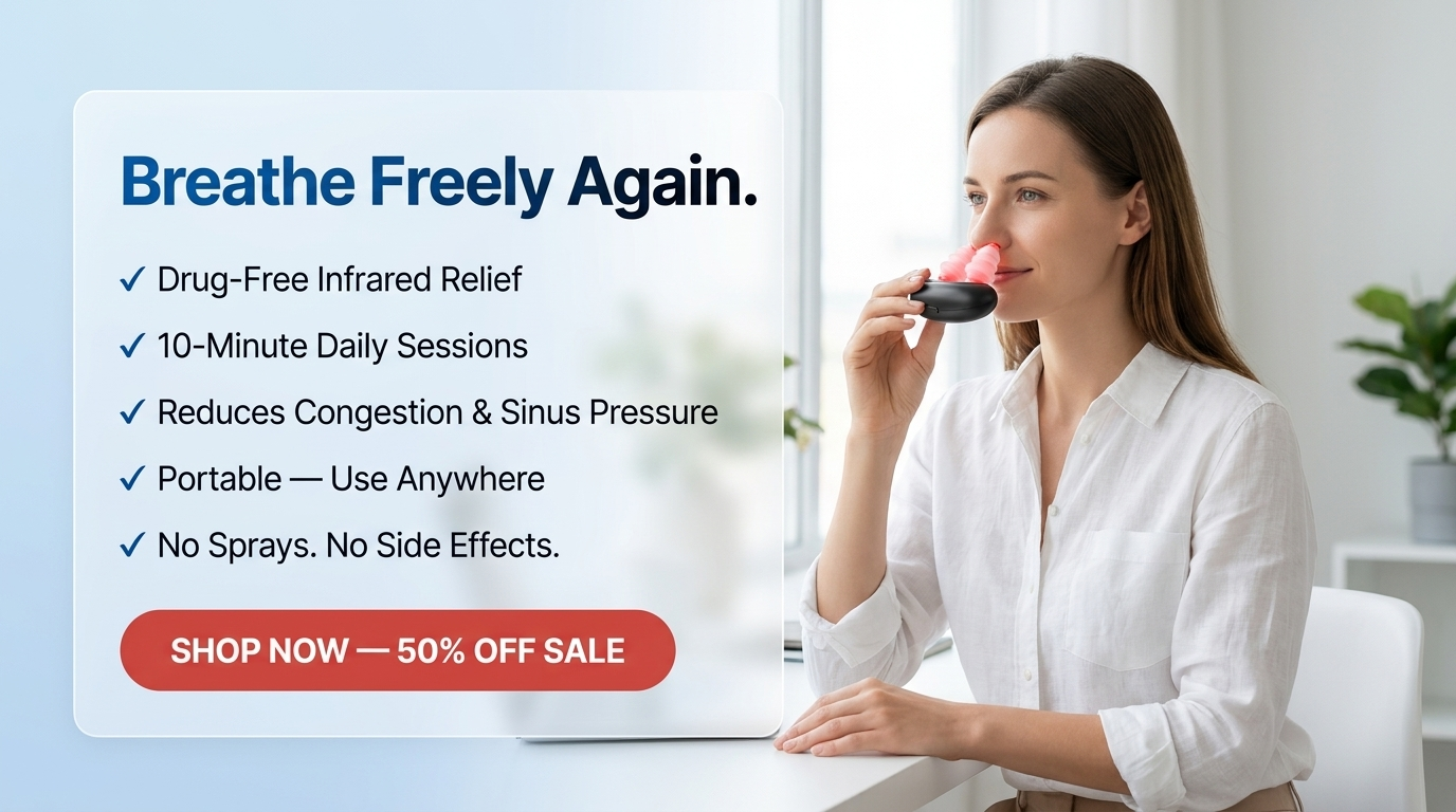 SHOP NOWAdvanced 630–650nm infrared light delivers gentle, non-invasive therapy to help relieve symptoms of rhinitis, sinus pressure, and nasal discomfort.